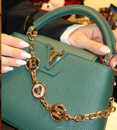 👜 Y la estrella del regalo: una cartera verde esmeralda de Louis Vuitton modelo Capucines, personalizada con las iniciales E y M, que rondaría los 6.500 euros (aproximadamente 7 millones de pesos).