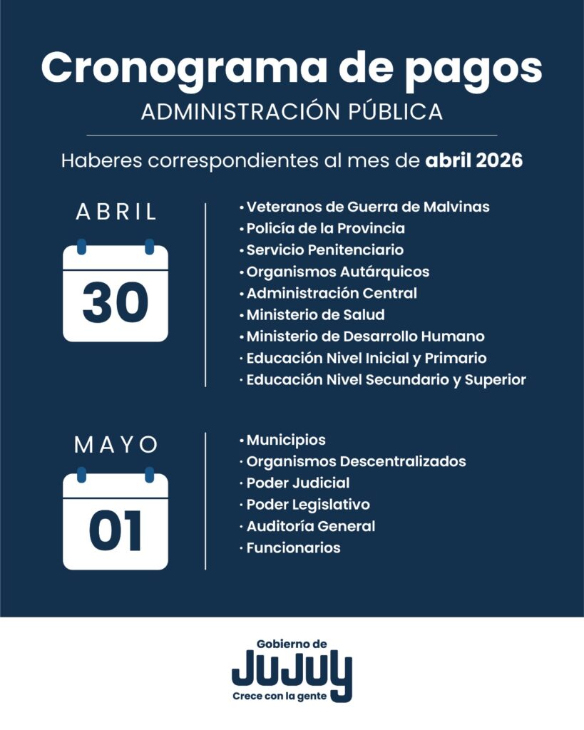 La Tesorería de la Provincia de Jujuy informó el cronograma de pagos de haberes correspondiente al mes de abril para los trabajadores de la administración pública provincial.